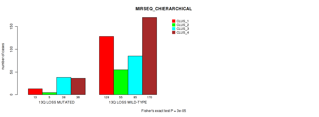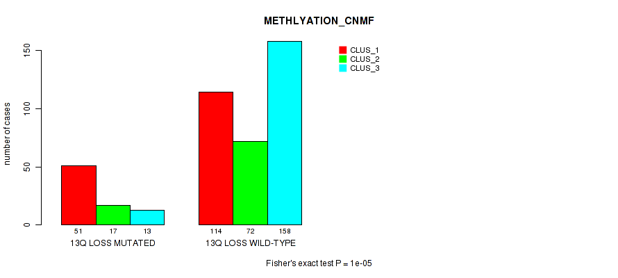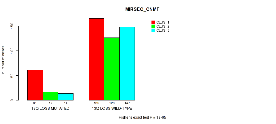 13q loss cnv correlated to 'CN_CNMF', 'METHLYATION_CNMF', 'MRNASEQ_CNMF', 'MRNASEQ_CHIERARCHICAL', 'MIRSEQ_CNMF', and 'MIRSEQ_CHIERARCHICAL'.