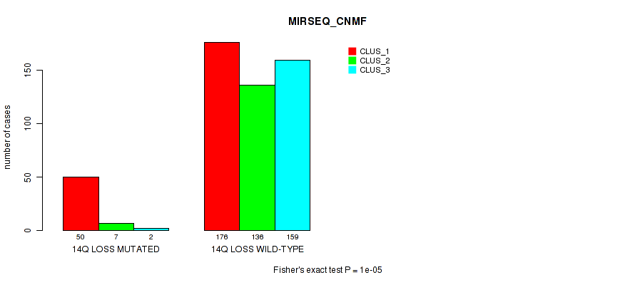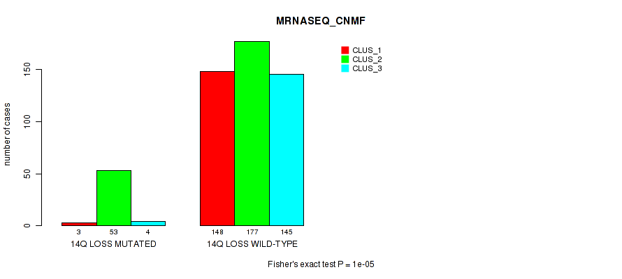 14q loss cnv correlated to 'MRNA_CHIERARCHICAL', 'CN_CNMF', 'METHLYATION_CNMF', 'MRNASEQ_CNMF', 'MRNASEQ_CHIERARCHICAL', 'MIRSEQ_CNMF', 'MIRSEQ_CHIERARCHICAL', and 'MIRSEQ_MATURE_CHIERARCHICAL'.
