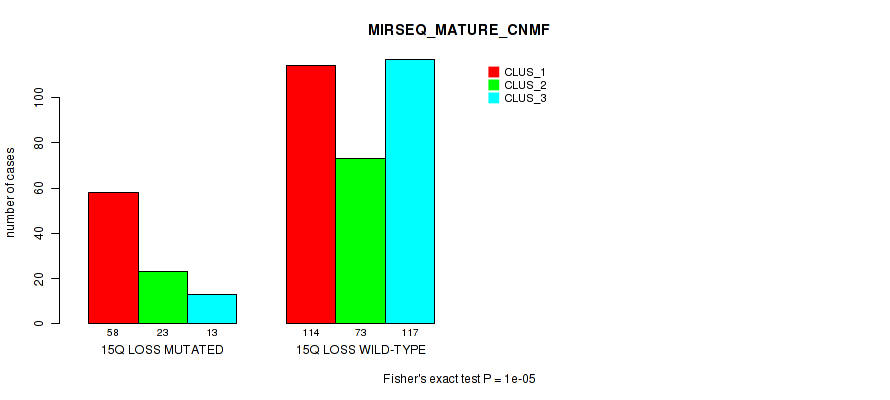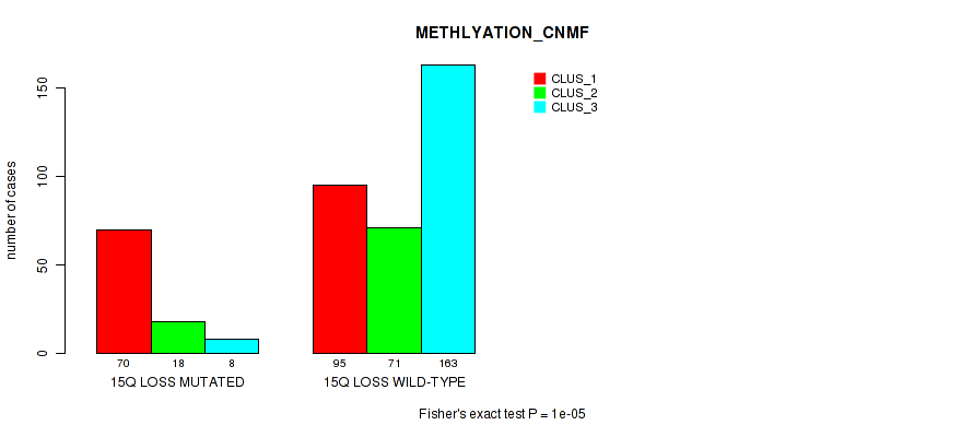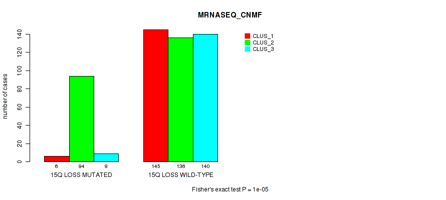 15q loss cnv correlated to 'MRNA_CHIERARCHICAL', 'CN_CNMF', 'METHLYATION_CNMF', 'MRNASEQ_CNMF', 'MRNASEQ_CHIERARCHICAL', 'MIRSEQ_CNMF', 'MIRSEQ_CHIERARCHICAL', 'MIRSEQ_MATURE_CNMF', and 'MIRSEQ_MATURE_CHIERARCHICAL'.