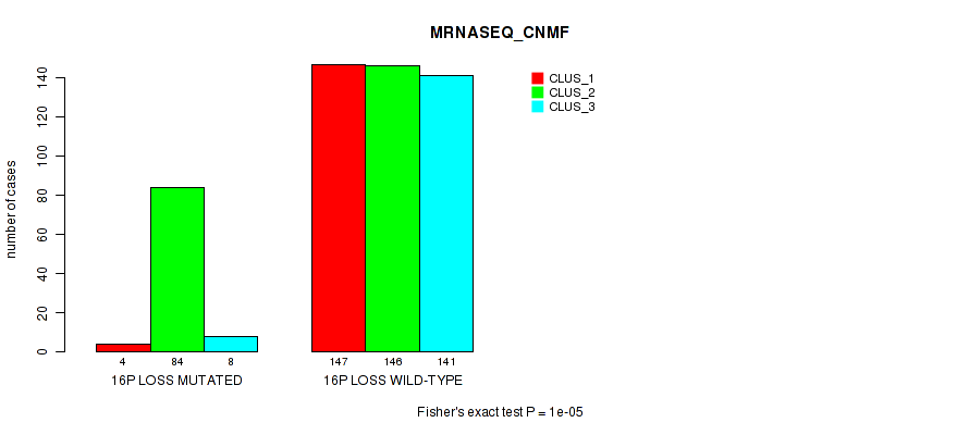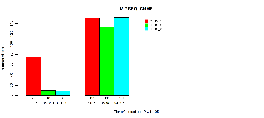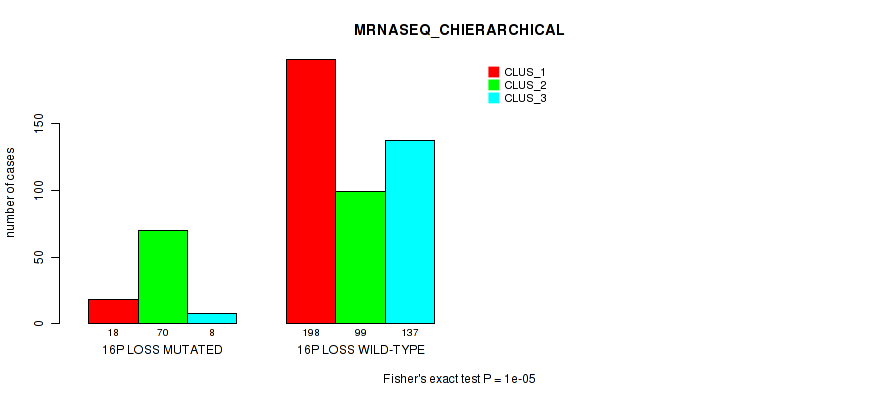 16p loss cnv correlated to 'CN_CNMF', 'METHLYATION_CNMF', 'MRNASEQ_CNMF', 'MRNASEQ_CHIERARCHICAL', 'MIRSEQ_CNMF', 'MIRSEQ_CHIERARCHICAL', and 'MIRSEQ_MATURE_CHIERARCHICAL'.