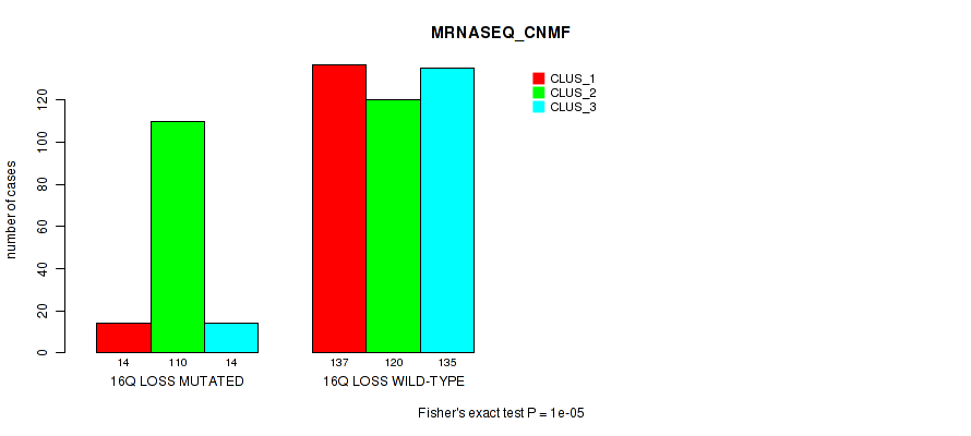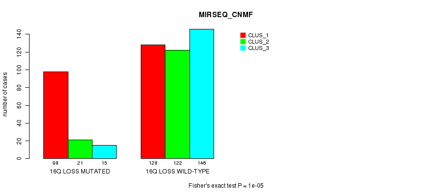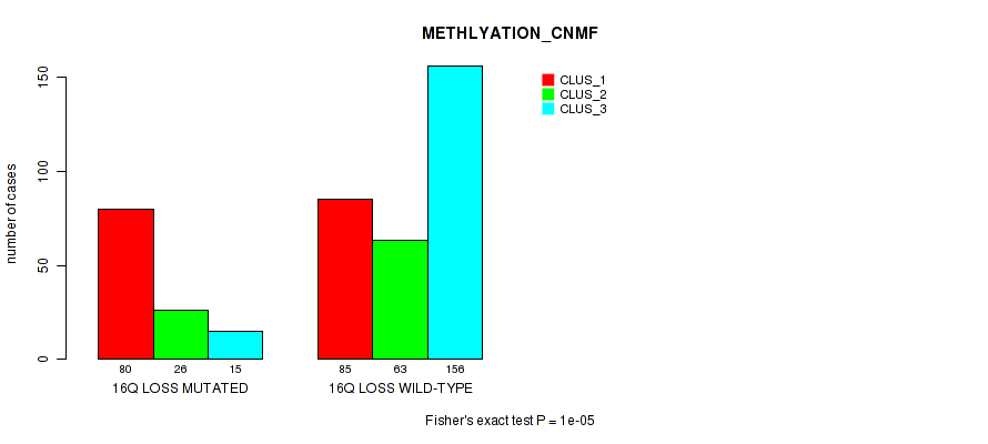 16q loss cnv correlated to 'CN_CNMF', 'METHLYATION_CNMF', 'MRNASEQ_CNMF', 'MRNASEQ_CHIERARCHICAL', 'MIRSEQ_CNMF', 'MIRSEQ_CHIERARCHICAL', 'MIRSEQ_MATURE_CNMF', and 'MIRSEQ_MATURE_CHIERARCHICAL'.