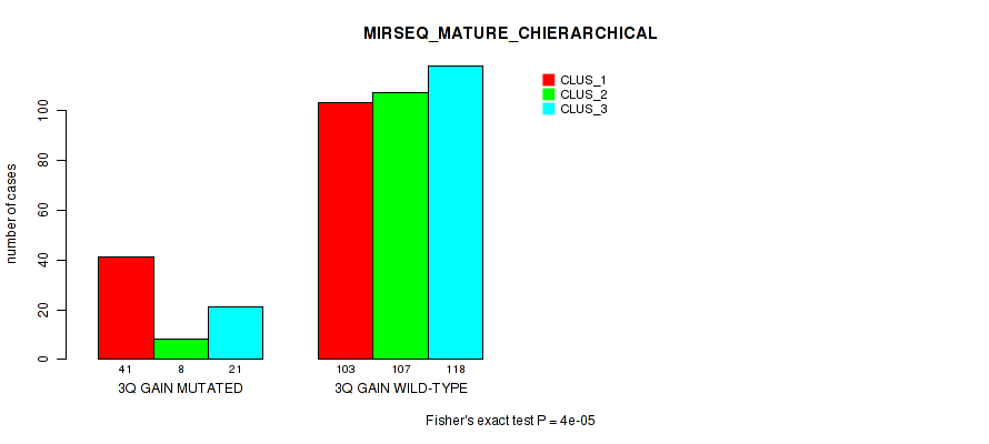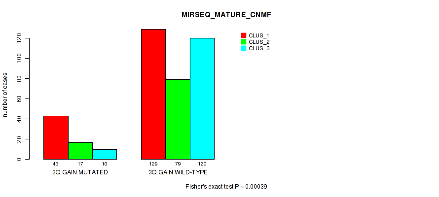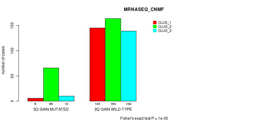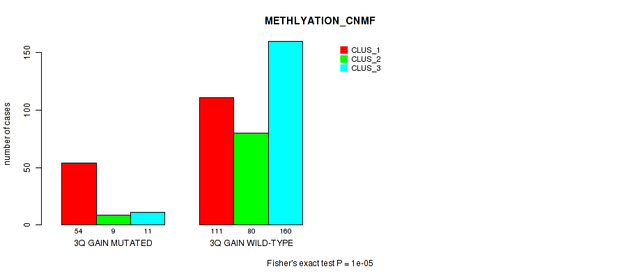 3q gain cnv correlated to 'CN_CNMF', 'METHLYATION_CNMF', 'MRNASEQ_CNMF', 'MRNASEQ_CHIERARCHICAL', 'MIRSEQ_CNMF', 'MIRSEQ_CHIERARCHICAL', 'MIRSEQ_MATURE_CNMF', and 'MIRSEQ_MATURE_CHIERARCHICAL'.