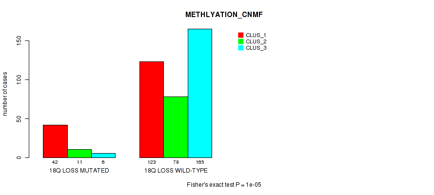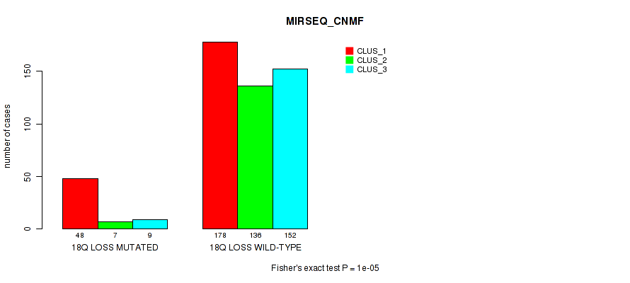 18q loss cnv correlated to 'CN_CNMF', 'METHLYATION_CNMF', 'MRNASEQ_CNMF', 'MRNASEQ_CHIERARCHICAL', 'MIRSEQ_CNMF', and 'MIRSEQ_CHIERARCHICAL'.