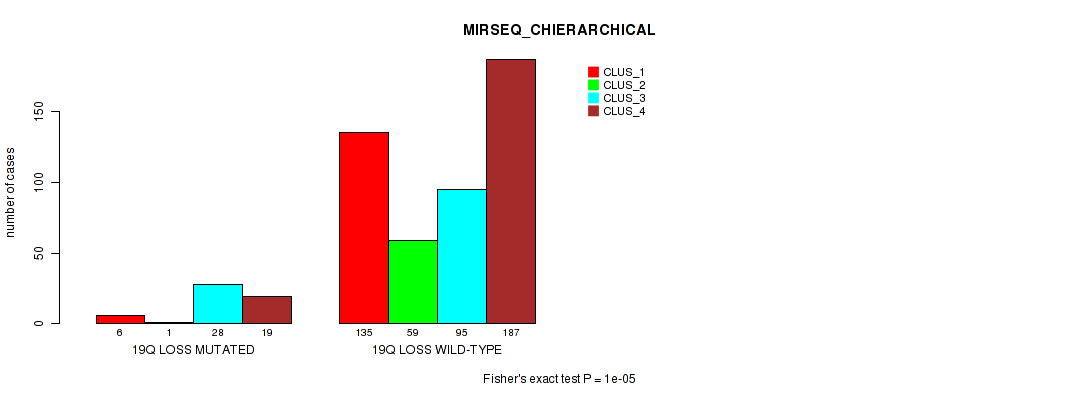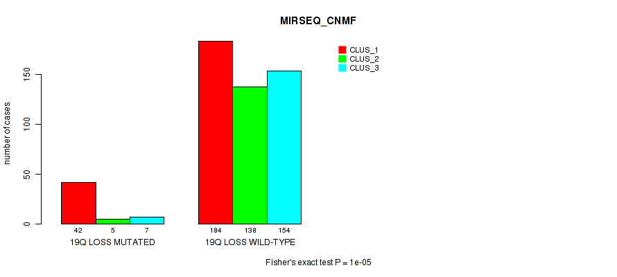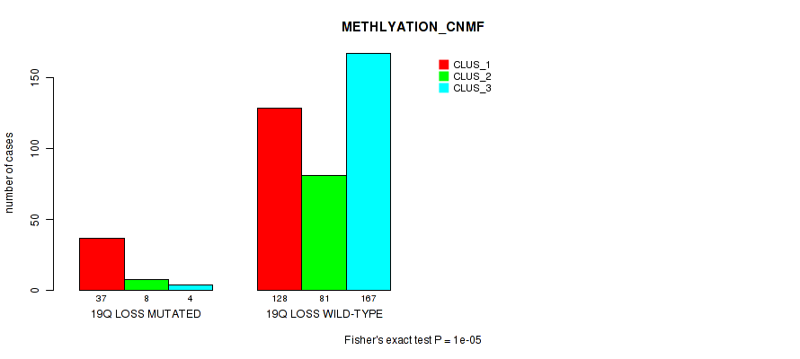 19q loss cnv correlated to 'CN_CNMF', 'METHLYATION_CNMF', 'MRNASEQ_CNMF', 'MRNASEQ_CHIERARCHICAL', 'MIRSEQ_CNMF', 'MIRSEQ_CHIERARCHICAL', and 'MIRSEQ_MATURE_CHIERARCHICAL'.
