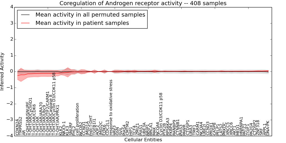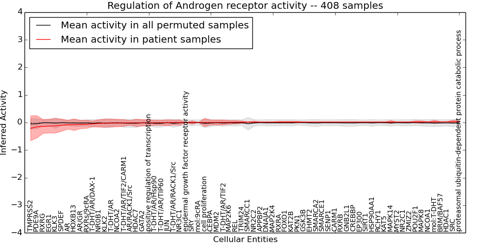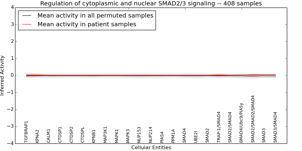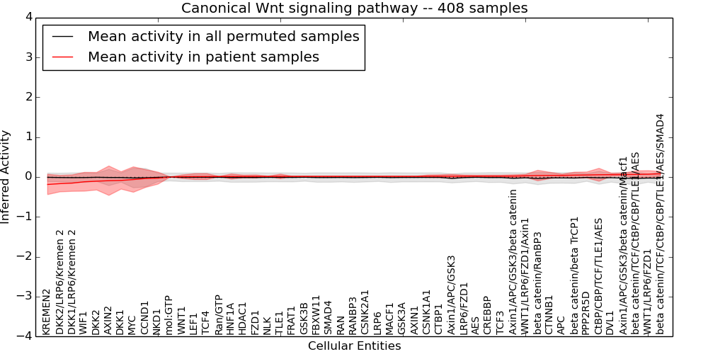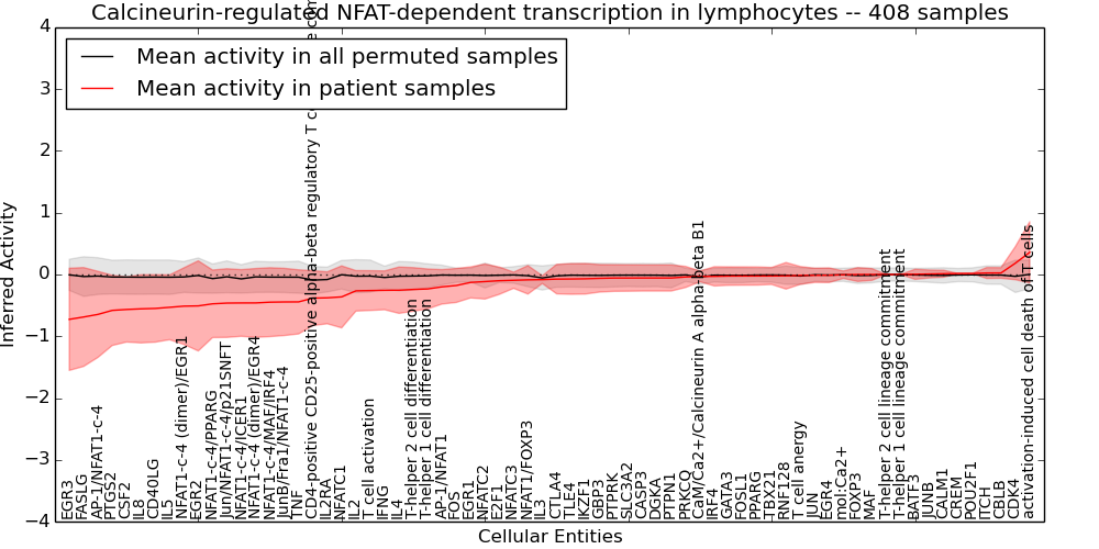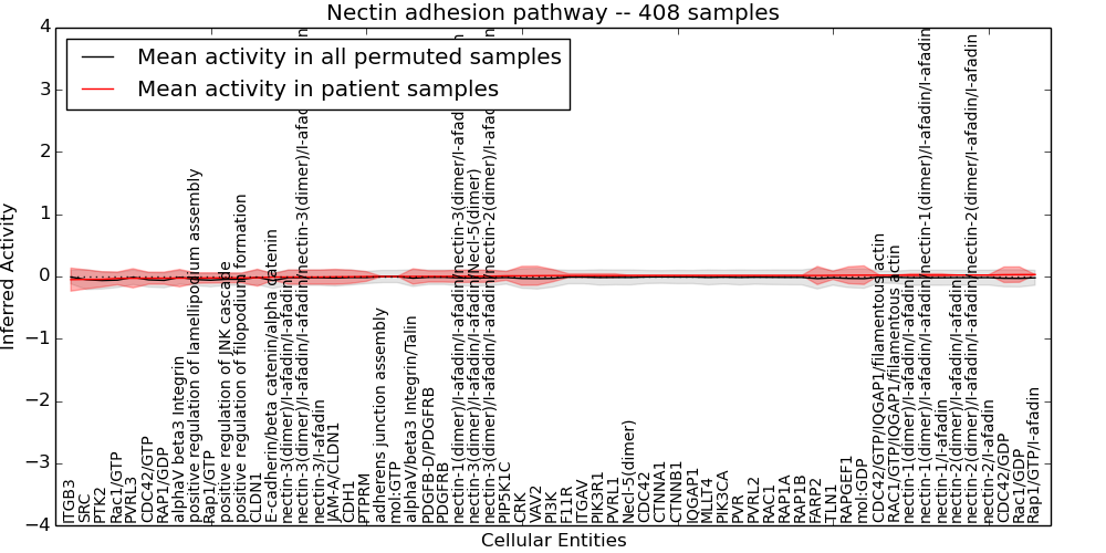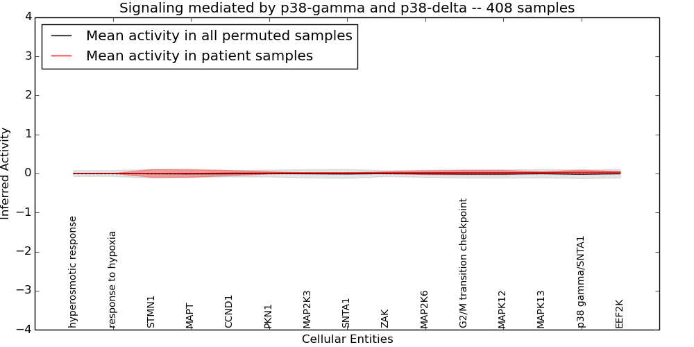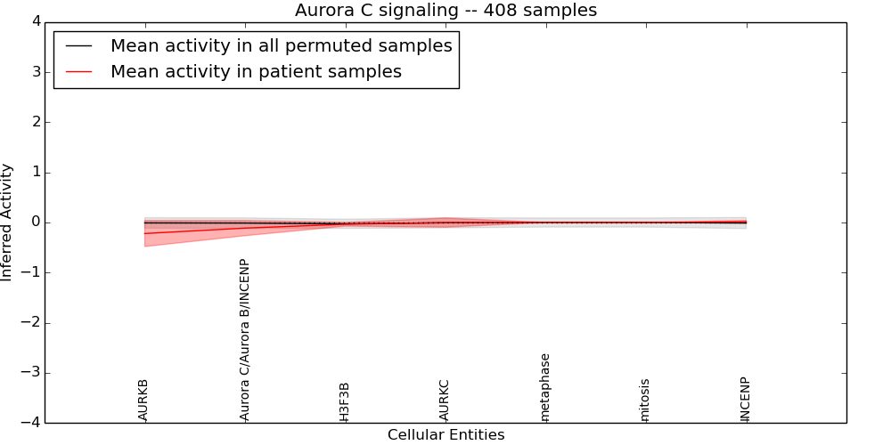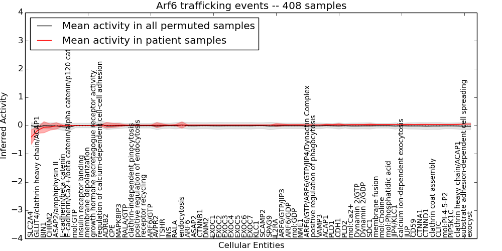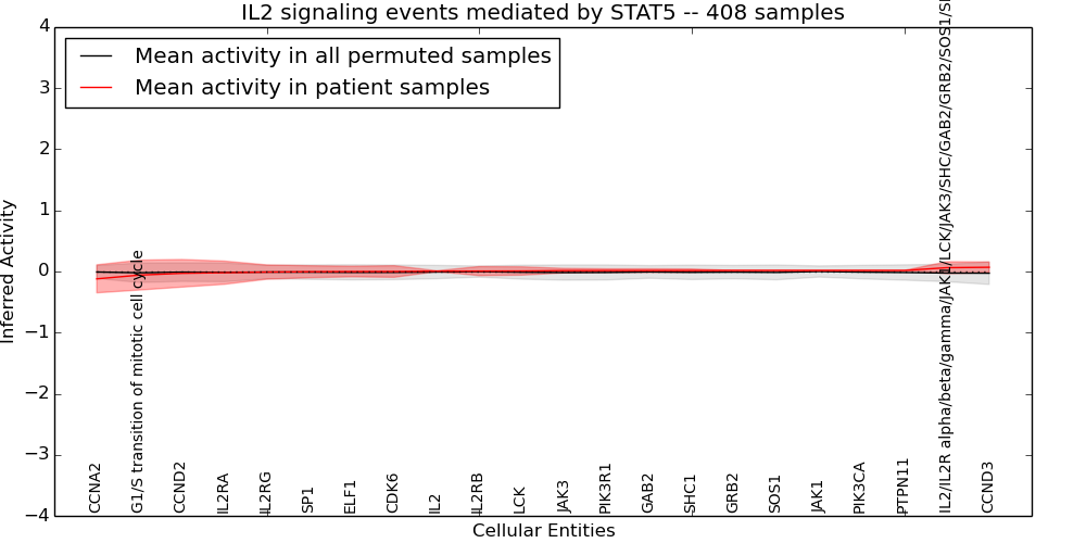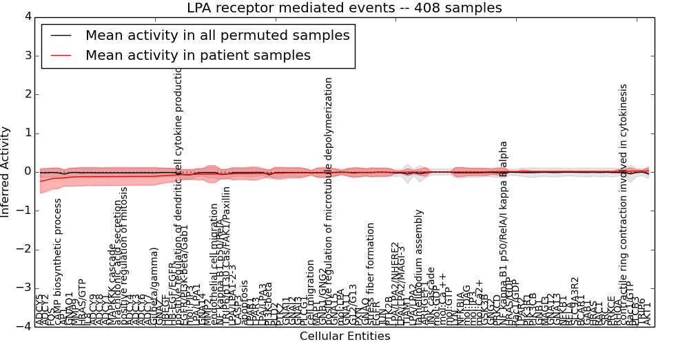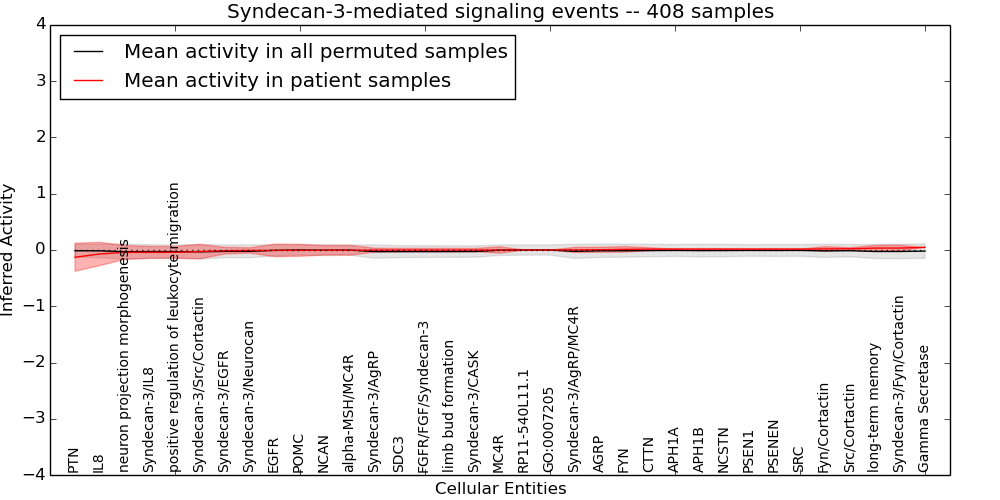 Figure S131. Get High-res Image This plot shows pathway concept perturbations across all samples against a permutation model. The concepts along the x-axis are sorted by lowest to highest mean activity for the real patient samples. Mean inferred activities are plotted along the y-axis as a colored band showing the average level and one standard deviation range. Real samples are shown in red and permuted samples in black.