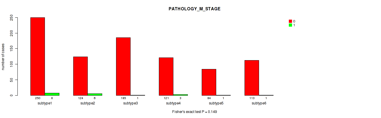 Table S150. Clustering Approach #12: 'MIRseq Mature cHierClus subtypes' versus Clinical Feature #6: 'PATHOLOGY_M_STAGE'