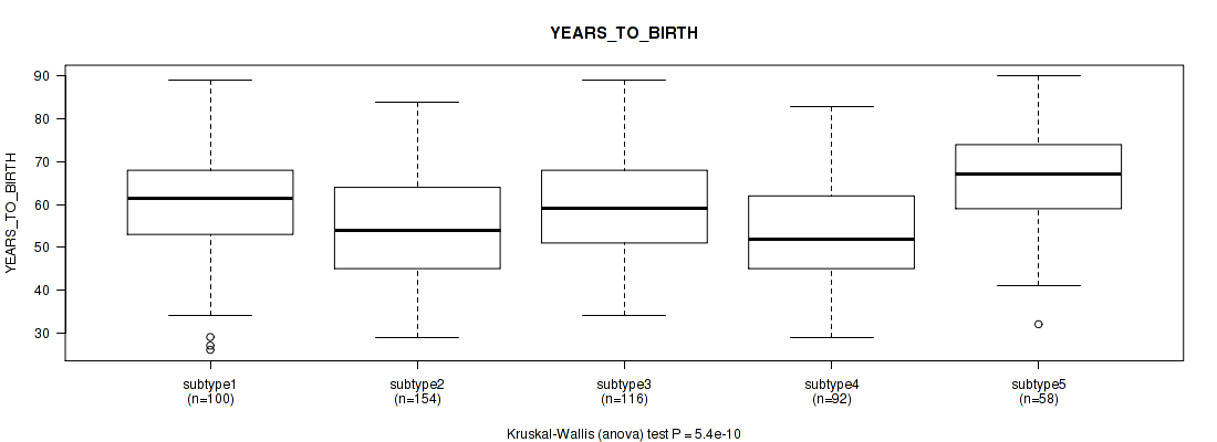 Consensus hierarchical clustering analysis on array-based mRNA expression data identified 5 subtypes that correlate to 'YEARS_TO_BIRTH', 'NEOPLASM_DISEASESTAGE', 'PATHOLOGY_T_STAGE', 'PATHOLOGY_N_STAGE', 'HISTOLOGICAL_TYPE', 'RADIATIONS_RADIATION_REGIMENINDICATION', 'NUMBER_OF_LYMPH_NODES', and 'RACE'.