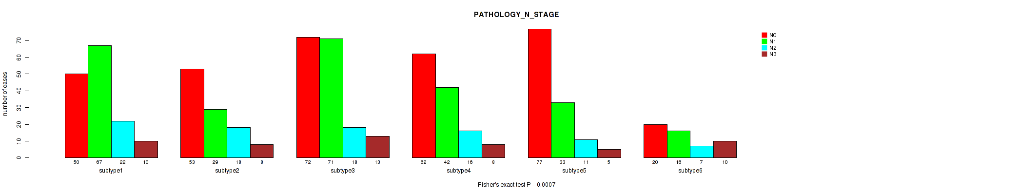 Consensus hierarchical clustering analysis on sequencing-based mRNA expression data identified 6 subtypes that correlate to 'Time to Death', 'YEARS_TO_BIRTH', 'NEOPLASM_DISEASESTAGE', 'PATHOLOGY_T_STAGE', 'PATHOLOGY_N_STAGE', 'GENDER', 'HISTOLOGICAL_TYPE', 'NUMBER_OF_LYMPH_NODES', and 'RACE'.