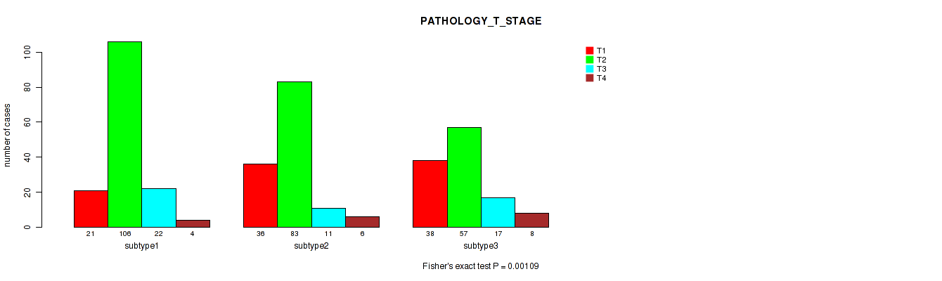 Figure S136. Get High-res Image Clustering Approach #12: 'MIRseq Mature cHierClus subtypes' versus Clinical Feature #4: 'PATHOLOGY_T_STAGE'