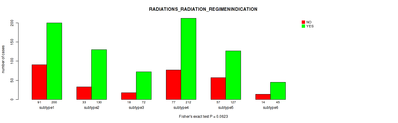 6 subtypes identified in current cancer cohort by 'MIRSEQ CHIERARCHICAL'. These subtypes correlate to 'Time to Death', 'YEARS_TO_BIRTH', 'NEOPLASM_DISEASESTAGE', 'PATHOLOGY_T_STAGE', 'PATHOLOGY_N_STAGE', 'GENDER', 'HISTOLOGICAL_TYPE', 'RADIATIONS_RADIATION_REGIMENINDICATION', 'NUMBER_OF_LYMPH_NODES', and 'RACE'.
