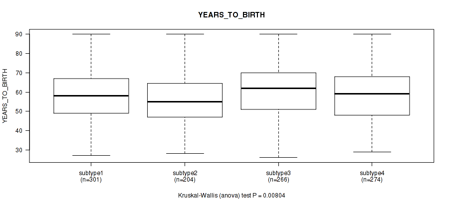 Figure S134. Get High-res Image Clustering Approach #12: 'MIRseq Mature cHierClus subtypes' versus Clinical Feature #2: 'YEARS_TO_BIRTH'