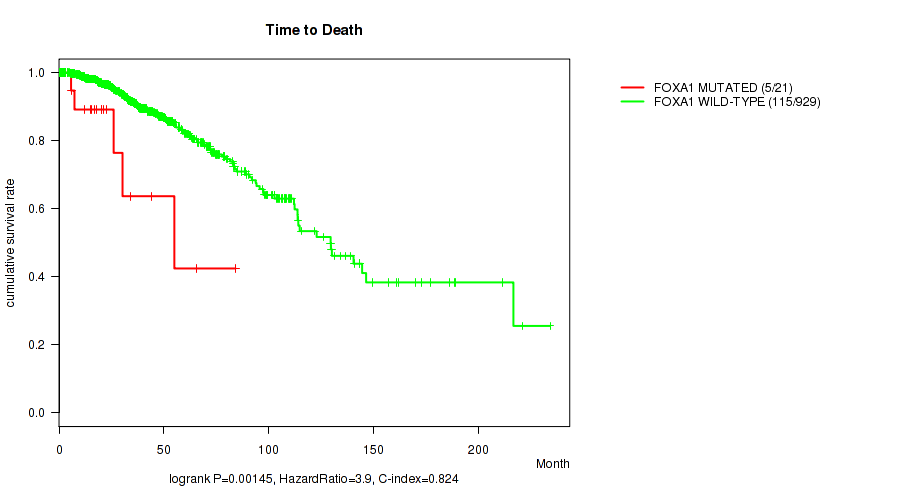 FOXA1 mutation correlated to 'Time to Death' and 'YEARS_TO_BIRTH'.