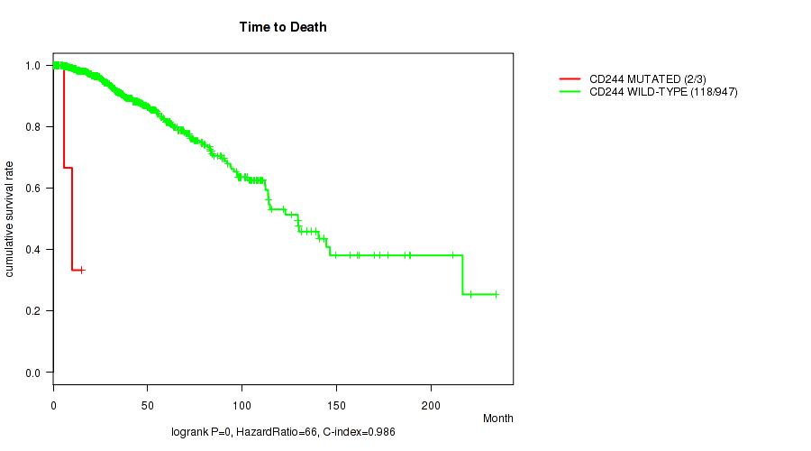 Figure S24. Get High-res Image Gene #151: 'CD244 MUTATION STATUS' versus Clinical Feature #1: 'Time to Death'