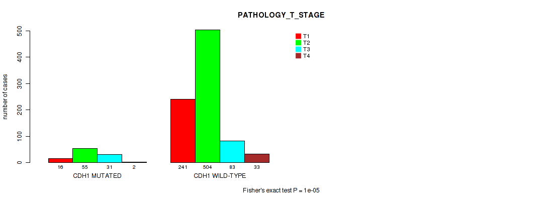 CDH1 mutation correlated to 'PATHOLOGY_T_STAGE', 'PATHOLOGY_N_STAGE', and 'HISTOLOGICAL_TYPE'.