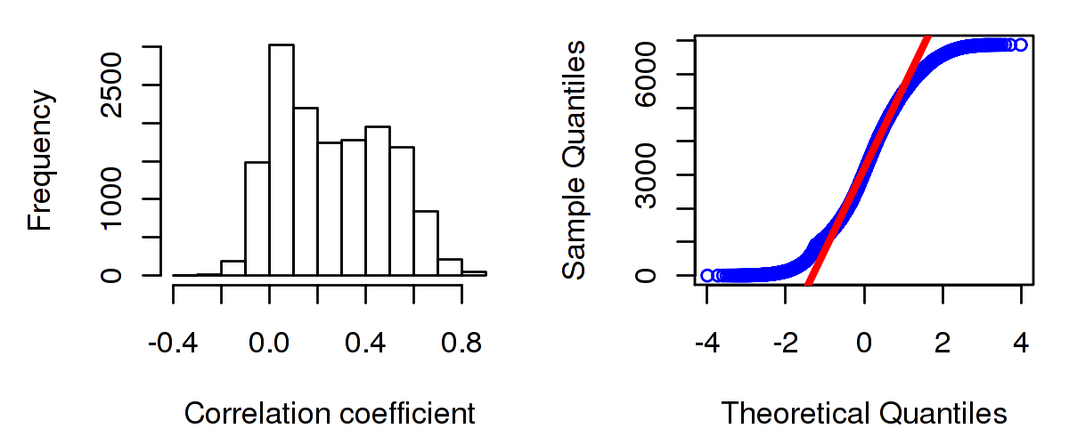 Figure 1. Summary figures. Left: histogram showing the distribution of the calculated correlations across samples for all Genes. Right: QQ plot of the calculated correlations across samples. The QQ plot is used to plot the quantiles of the calculated correlation coefficients against that derived from a normal distribution. Points deviating from the blue line indicate deviation from normality.