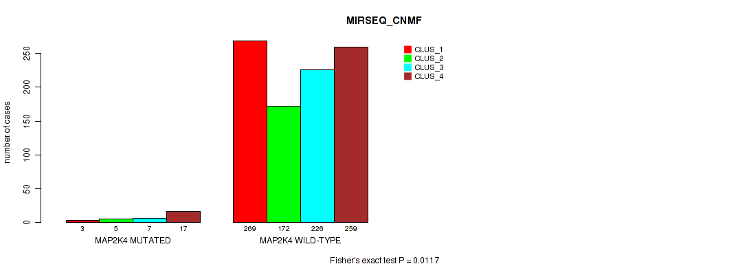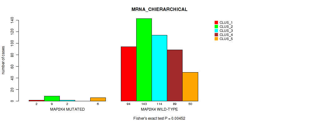 MAP2K4 mutation correlated to 'MRNA_CHIERARCHICAL', 'METHLYATION_CNMF', 'RPPA_CNMF', 'MRNASEQ_CNMF', 'MRNASEQ_CHIERARCHICAL', 'MIRSEQ_CNMF', 'MIRSEQ_CHIERARCHICAL', 'MIRSEQ_MATURE_CNMF', and 'MIRSEQ_MATURE_CHIERARCHICAL'.
