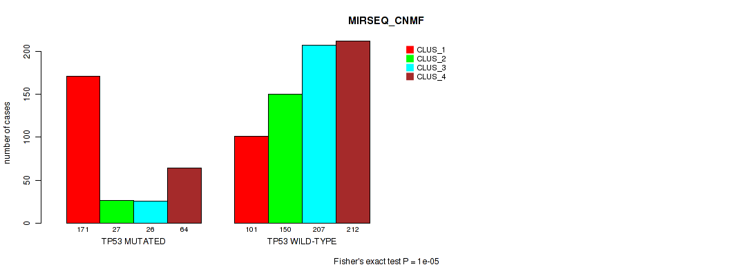 TP53 mutation correlated to 'MRNA_CNMF', 'MRNA_CHIERARCHICAL', 'CN_CNMF', 'METHLYATION_CNMF', 'RPPA_CNMF', 'RPPA_CHIERARCHICAL', 'MRNASEQ_CNMF', 'MRNASEQ_CHIERARCHICAL', 'MIRSEQ_CNMF', 'MIRSEQ_CHIERARCHICAL', 'MIRSEQ_MATURE_CNMF', and 'MIRSEQ_MATURE_CHIERARCHICAL'.