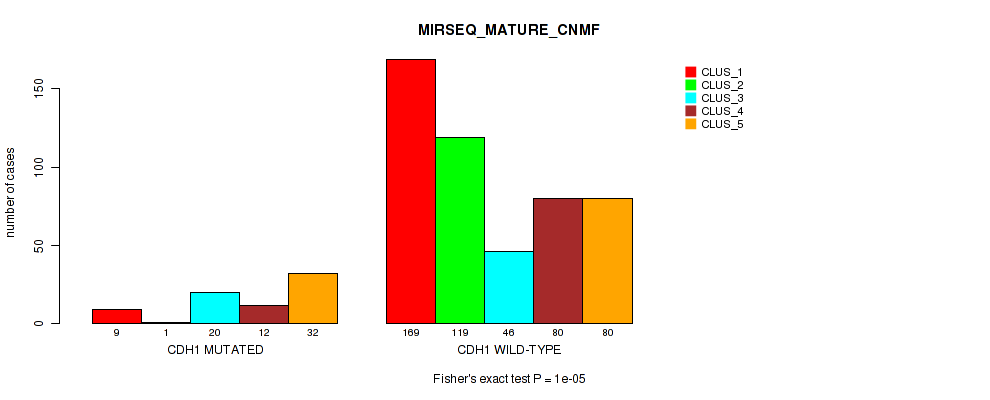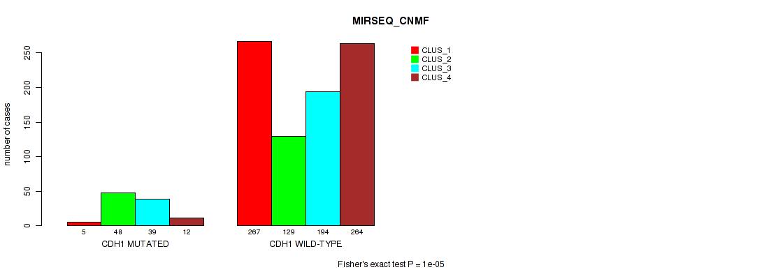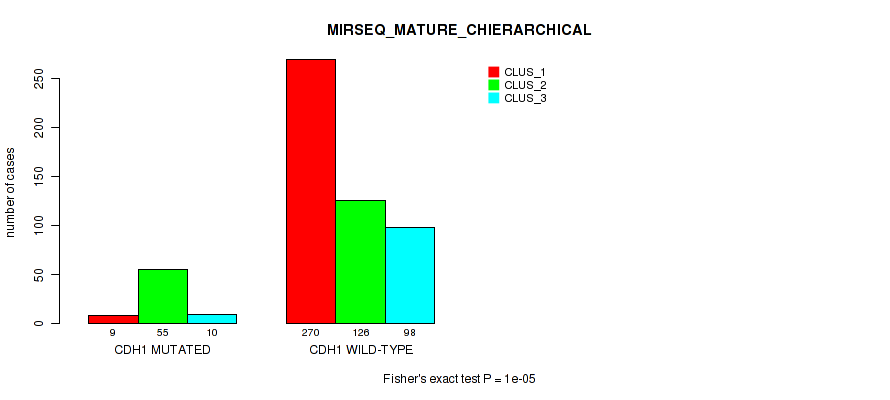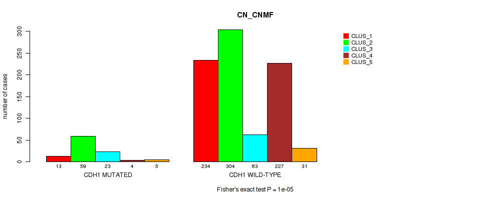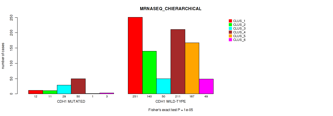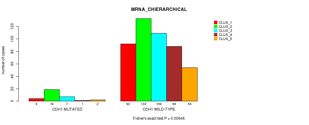 CDH1 mutation correlated to 'MRNA_CNMF', 'MRNA_CHIERARCHICAL', 'CN_CNMF', 'METHLYATION_CNMF', 'RPPA_CNMF', 'MRNASEQ_CNMF', 'MRNASEQ_CHIERARCHICAL', 'MIRSEQ_CNMF', 'MIRSEQ_CHIERARCHICAL', 'MIRSEQ_MATURE_CNMF', and 'MIRSEQ_MATURE_CHIERARCHICAL'.