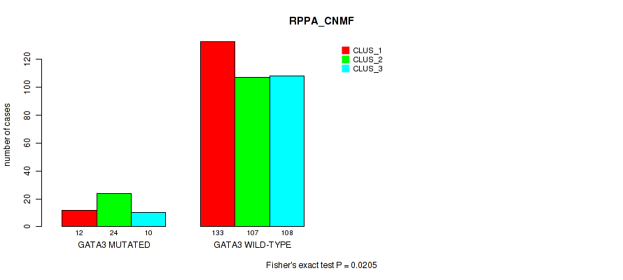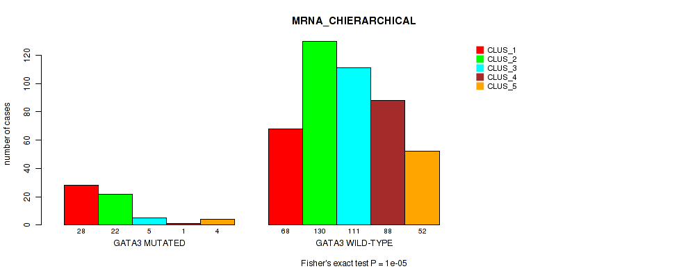 GATA3 mutation correlated to 'MRNA_CNMF', 'MRNA_CHIERARCHICAL', 'CN_CNMF', 'METHLYATION_CNMF', 'RPPA_CHIERARCHICAL', 'MRNASEQ_CNMF', 'MRNASEQ_CHIERARCHICAL', 'MIRSEQ_CNMF', 'MIRSEQ_CHIERARCHICAL', and 'MIRSEQ_MATURE_CNMF'.