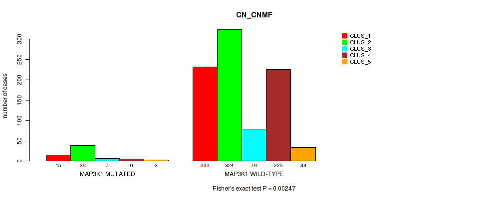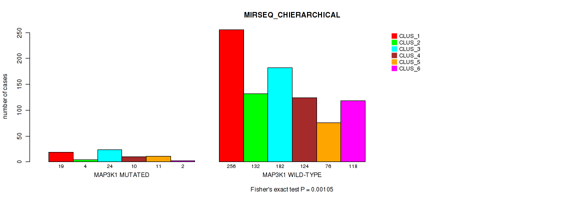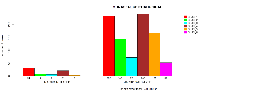 MAP3K1 mutation correlated to 'MRNA_CNMF', 'MRNA_CHIERARCHICAL', 'CN_CNMF', 'RPPA_CNMF', 'RPPA_CHIERARCHICAL', 'MRNASEQ_CNMF', 'MRNASEQ_CHIERARCHICAL', 'MIRSEQ_CNMF', and 'MIRSEQ_CHIERARCHICAL'.