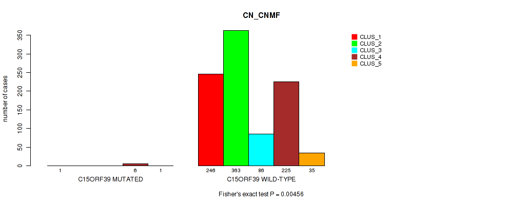 C15ORF39 mutation correlated to 'CN_CNMF', 'MRNASEQ_CNMF', and 'MRNASEQ_CHIERARCHICAL'.