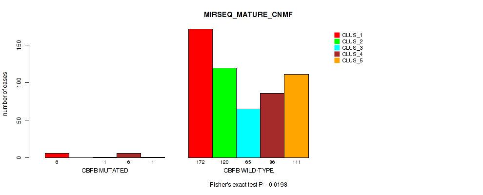 CBFB mutation correlated to 'METHLYATION_CNMF', 'MIRSEQ_CHIERARCHICAL', and 'MIRSEQ_MATURE_CHIERARCHICAL'.