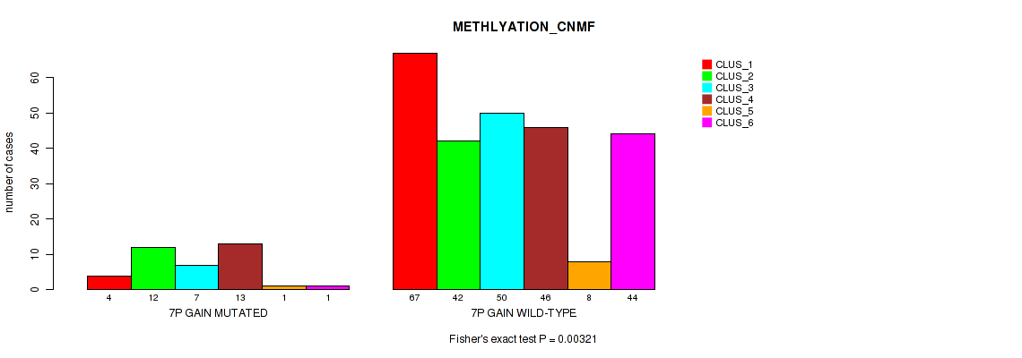 7p gain cnv correlated to 'METHLYATION_CNMF', 'MRNASEQ_CNMF', and 'MIRSEQ_CNMF'.