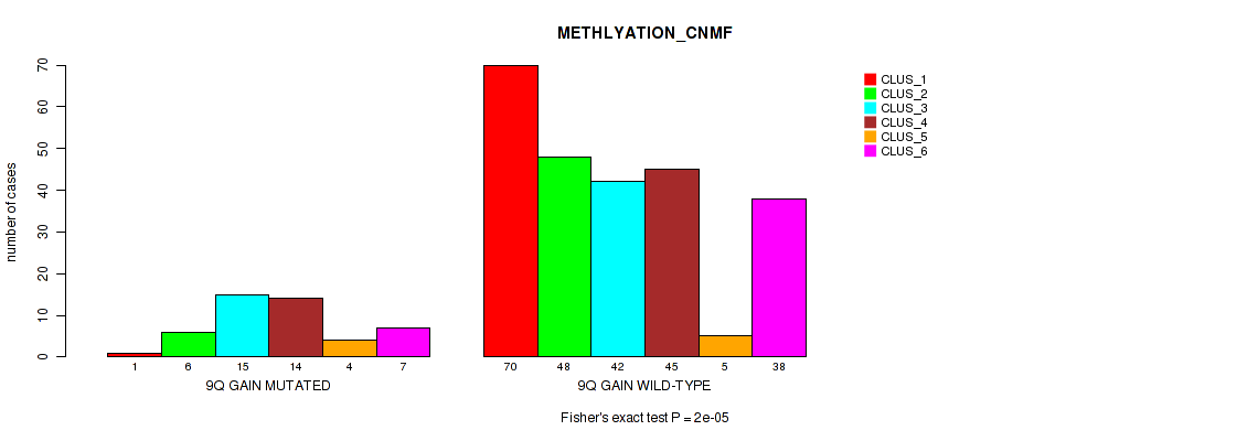 9p gain cnv correlated to 'METHLYATION_CNMF', 'RPPA_CNMF', 'MRNASEQ_CHIERARCHICAL', 'MIRSEQ_CHIERARCHICAL', and 'MIRSEQ_MATURE_CHIERARCHICAL'.