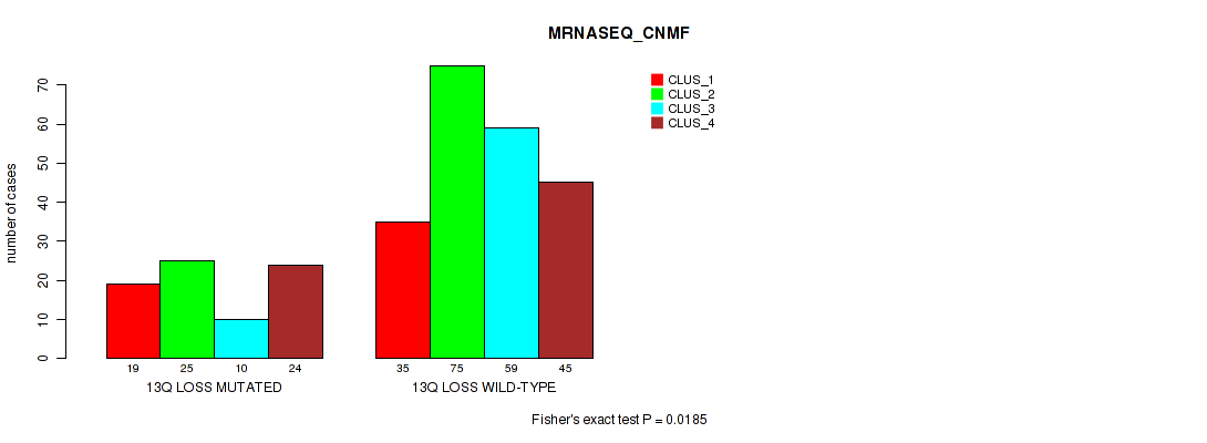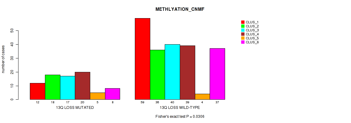 13q loss cnv correlated to 'CN_CNMF', 'METHLYATION_CNMF', 'MRNASEQ_CNMF', 'MRNASEQ_CHIERARCHICAL', and 'MIRSEQ_CHIERARCHICAL'.