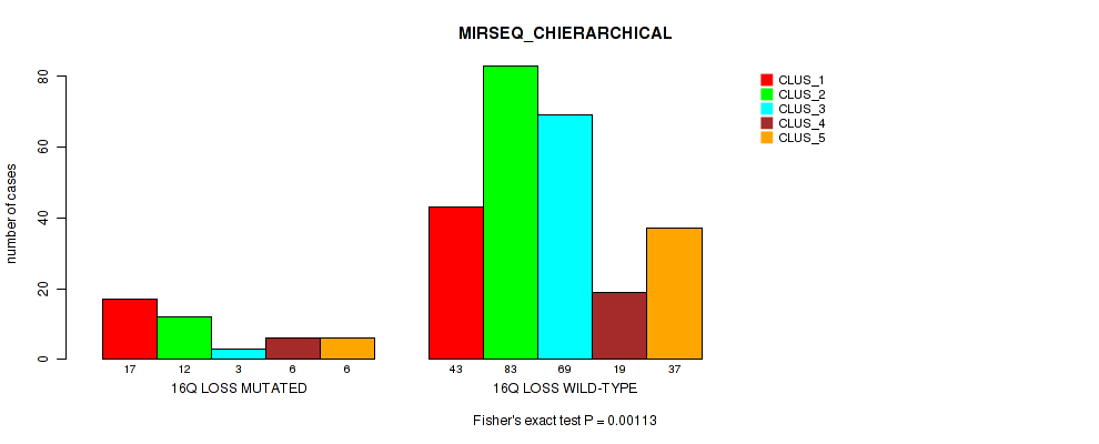 16q loss cnv correlated to 'METHLYATION_CNMF', 'MRNASEQ_CNMF', 'MRNASEQ_CHIERARCHICAL', 'MIRSEQ_CNMF', 'MIRSEQ_CHIERARCHICAL', and 'MIRSEQ_MATURE_CHIERARCHICAL'.