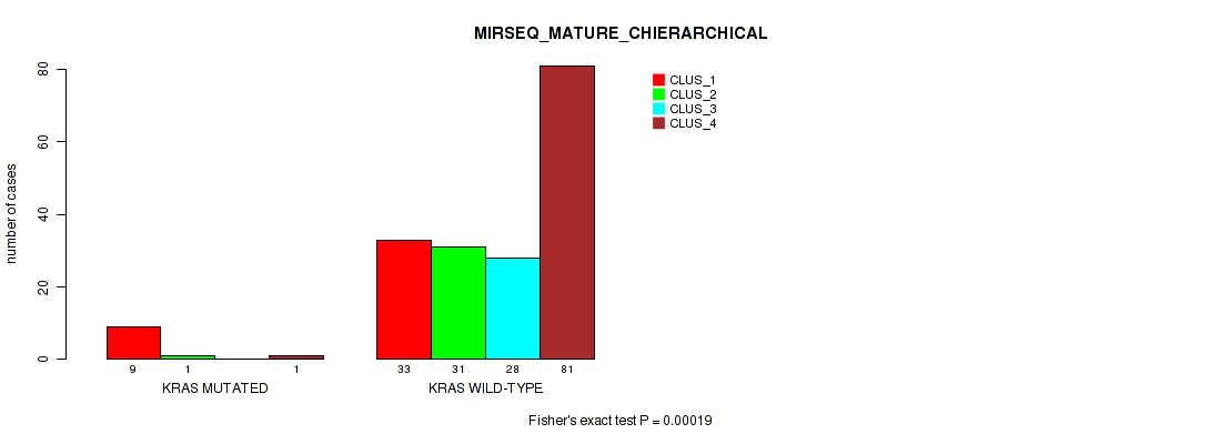 KRAS mutation correlated to 'METHLYATION_CNMF', 'MRNASEQ_CNMF', 'MRNASEQ_CHIERARCHICAL', 'MIRSEQ_CNMF', 'MIRSEQ_CHIERARCHICAL', and 'MIRSEQ_MATURE_CHIERARCHICAL'.