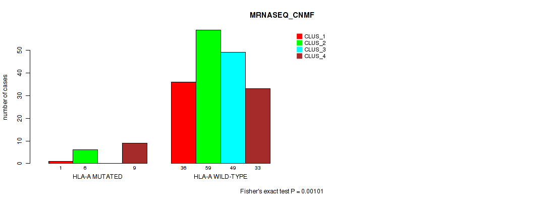 HLA-A mutation correlated to 'MRNASEQ_CNMF' and 'MIRSEQ_CHIERARCHICAL'.