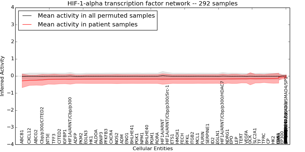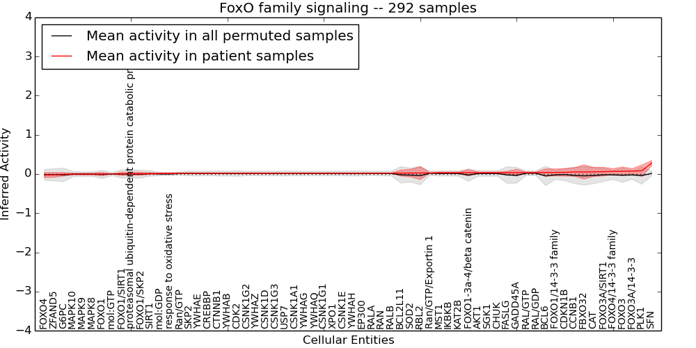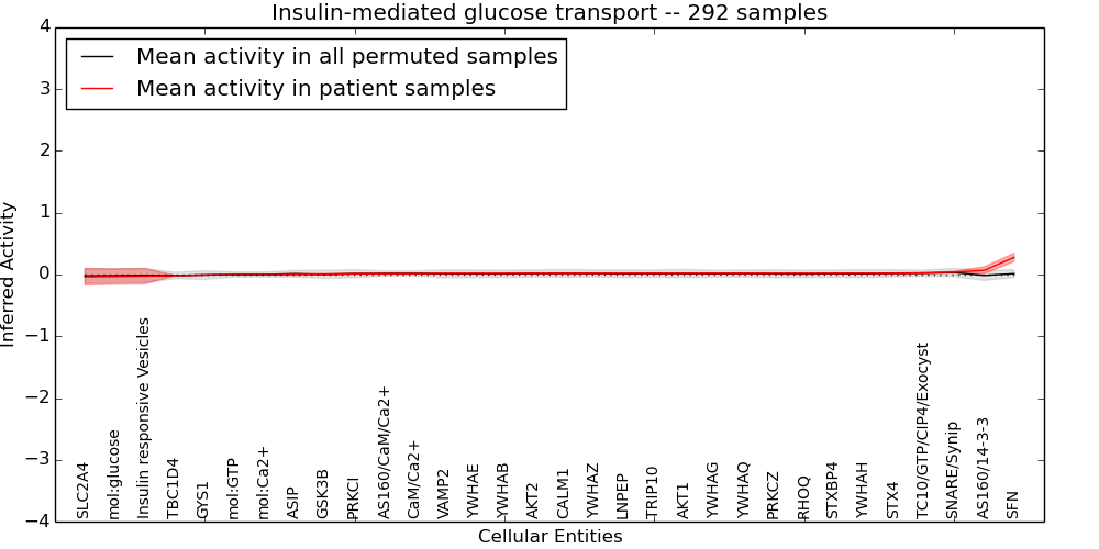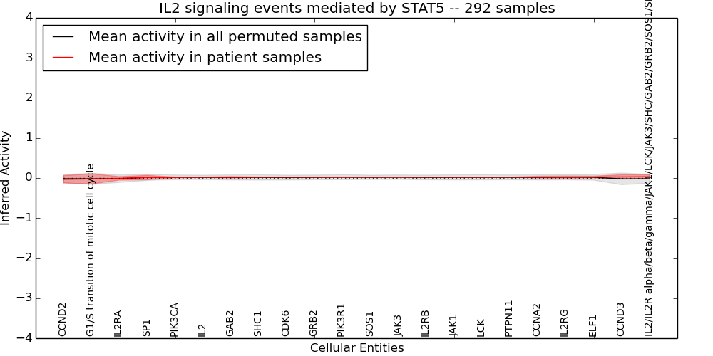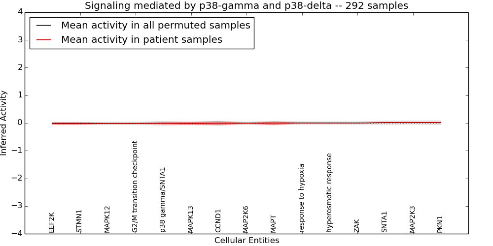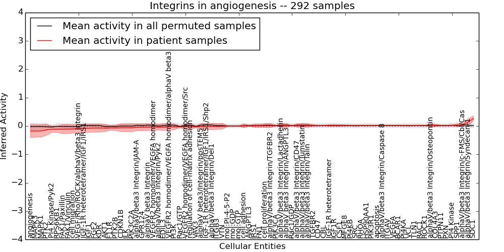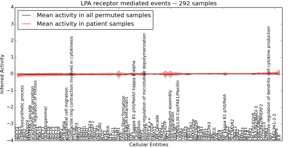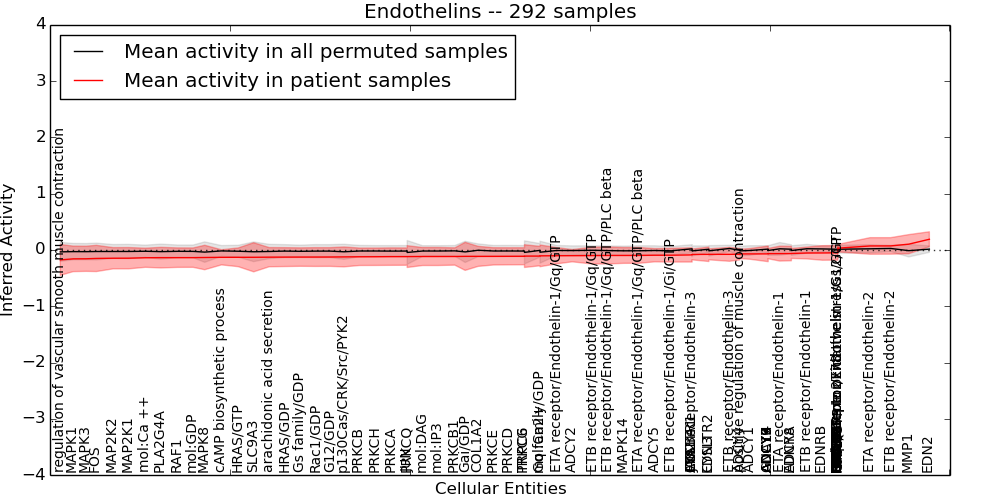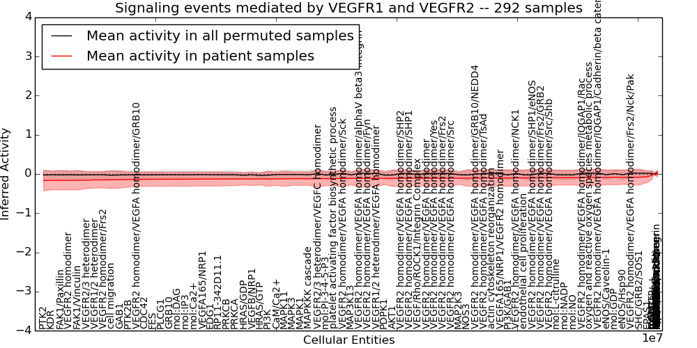Figure S131. Get High-res Image This plot shows pathway concept perturbations across all samples against a permutation model. The concepts along the x-axis are sorted by lowest to highest mean activity for the real patient samples. Mean inferred activities are plotted along the y-axis as a colored band showing the average level and one standard deviation range. Real samples are shown in red and permuted samples in black.