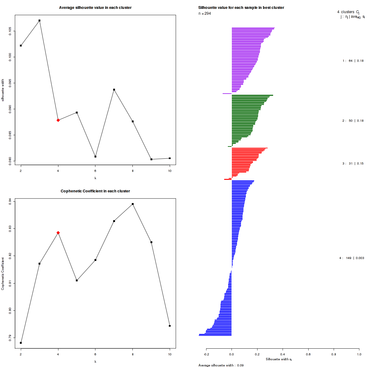 The cophenetic correlation coefficients and average silhouette values are used to determine the k with the most robust clusterings. From the plot of cophenetic correlation versus k, we select modes and the the point preceding the greatest decrease in cophenetic correlation coefficient, and from these choose the k with the highest average silhouette value.