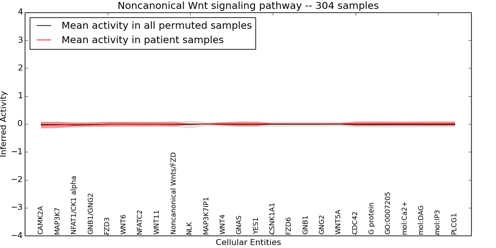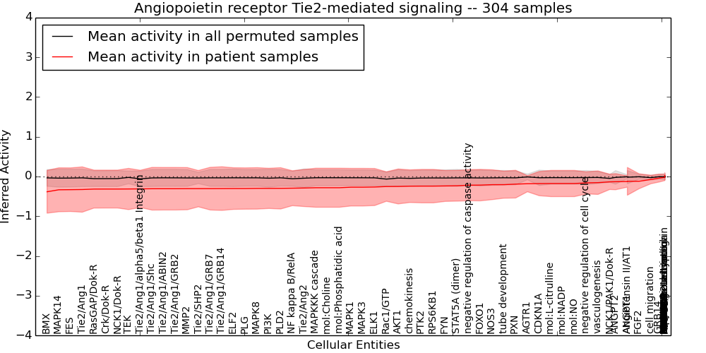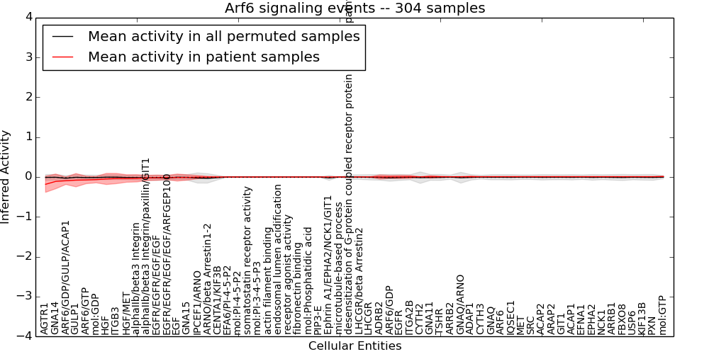 Figure S131. Get High-res Image This plot shows pathway concept perturbations across all samples against a permutation model. The concepts along the x-axis are sorted by lowest to highest mean activity for the real patient samples. Mean inferred activities are plotted along the y-axis as a colored band showing the average level and one standard deviation range. Real samples are shown in red and permuted samples in black.