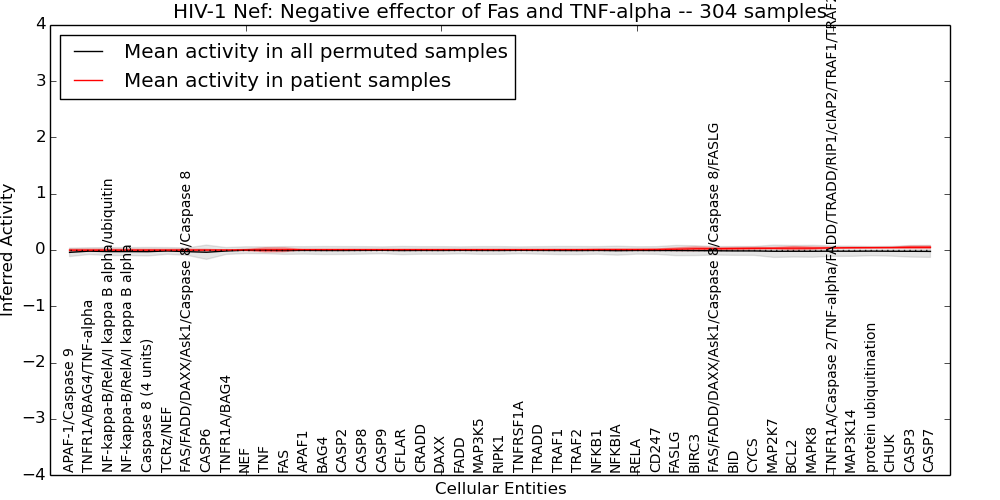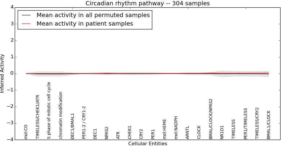 Figure S130. Get High-res Image This plot shows pathway concept perturbations across all samples against a permutation model. The concepts along the x-axis are sorted by lowest to highest mean activity for the real patient samples. Mean inferred activities are plotted along the y-axis as a colored band showing the average level and one standard deviation range. Real samples are shown in red and permuted samples in black.