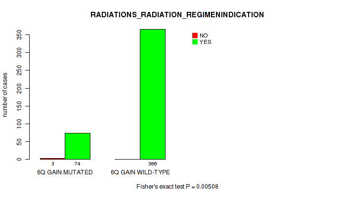 6q gain cnv correlated to 'NEOPLASM_DISEASESTAGE', 'PATHOLOGY_N_STAGE', 'RADIATIONS_RADIATION_REGIMENINDICATION', and 'NUMBER_OF_LYMPH_NODES'.