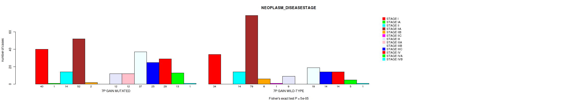 7p gain cnv correlated to 'NEOPLASM_DISEASESTAGE', 'PATHOLOGY_N_STAGE', 'PATHOLOGY_M_STAGE', 'HISTOLOGICAL_TYPE', and 'NUMBER_OF_LYMPH_NODES'.