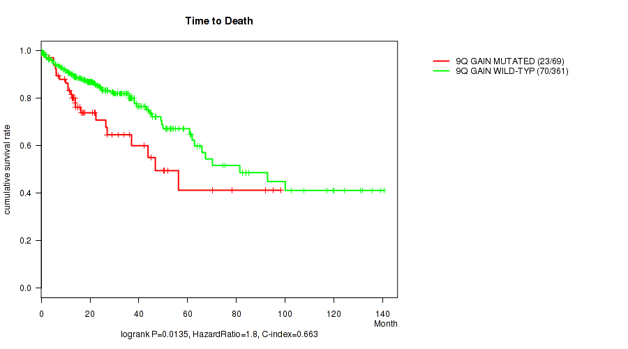 9q gain cnv correlated to 'Time to Death' and 'HISTOLOGICAL_TYPE'.