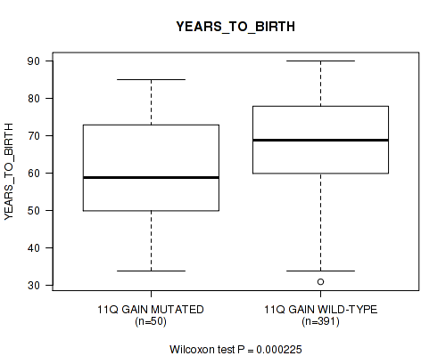 11q gain cnv correlated to 'YEARS_TO_BIRTH', 'NEOPLASM_DISEASESTAGE', 'PATHOLOGY_N_STAGE', 'HISTOLOGICAL_TYPE', 'RADIATIONS_RADIATION_REGIMENINDICATION', and 'NUMBER_OF_LYMPH_NODES'.