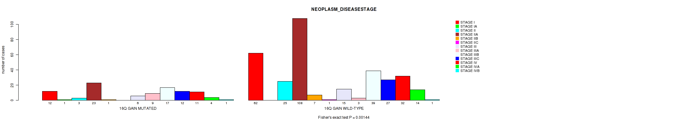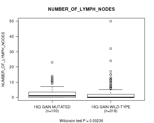 16q gain cnv correlated to 'NEOPLASM_DISEASESTAGE', 'PATHOLOGY_N_STAGE', 'HISTOLOGICAL_TYPE', and 'NUMBER_OF_LYMPH_NODES'.