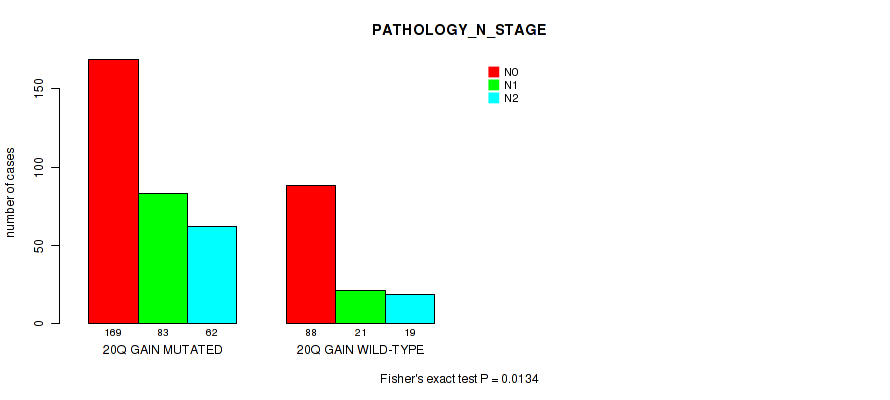 20q gain cnv correlated to 'NEOPLASM_DISEASESTAGE', 'PATHOLOGY_N_STAGE', 'PATHOLOGY_M_STAGE', 'HISTOLOGICAL_TYPE', and 'NUMBER_OF_LYMPH_NODES'.