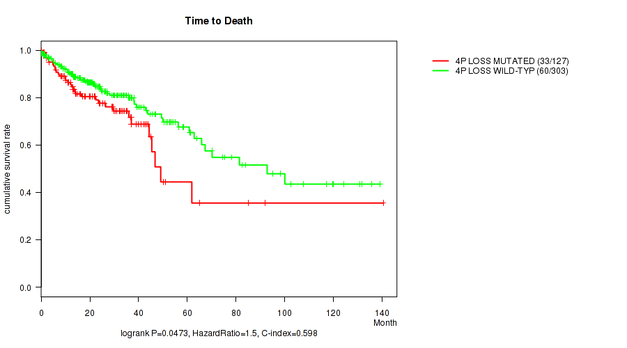 4p loss cnv correlated to 'Time to Death', 'NEOPLASM_DISEASESTAGE', 'PATHOLOGY_N_STAGE', 'PATHOLOGY_M_STAGE', 'HISTOLOGICAL_TYPE', 'RADIATIONS_RADIATION_REGIMENINDICATION', 'COMPLETENESS_OF_RESECTION', and 'NUMBER_OF_LYMPH_NODES'.