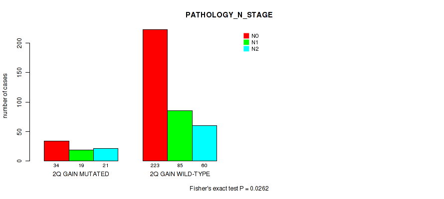 2q gain cnv correlated to 'PATHOLOGY_N_STAGE' and 'NUMBER_OF_LYMPH_NODES'.