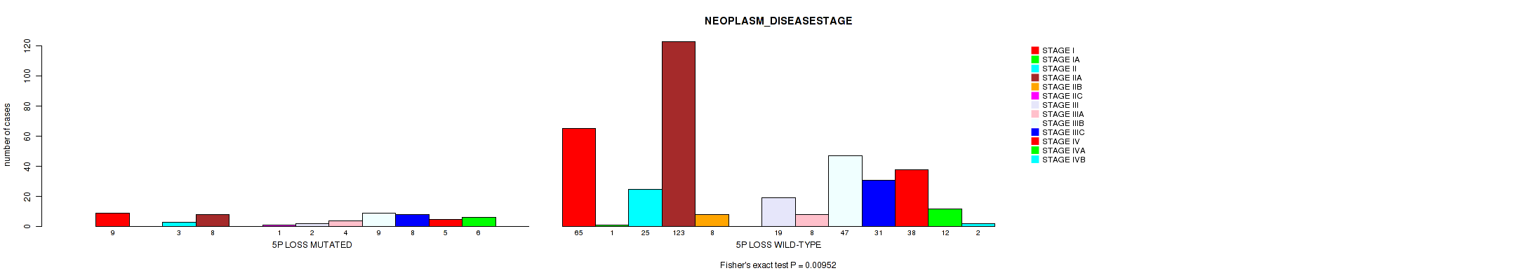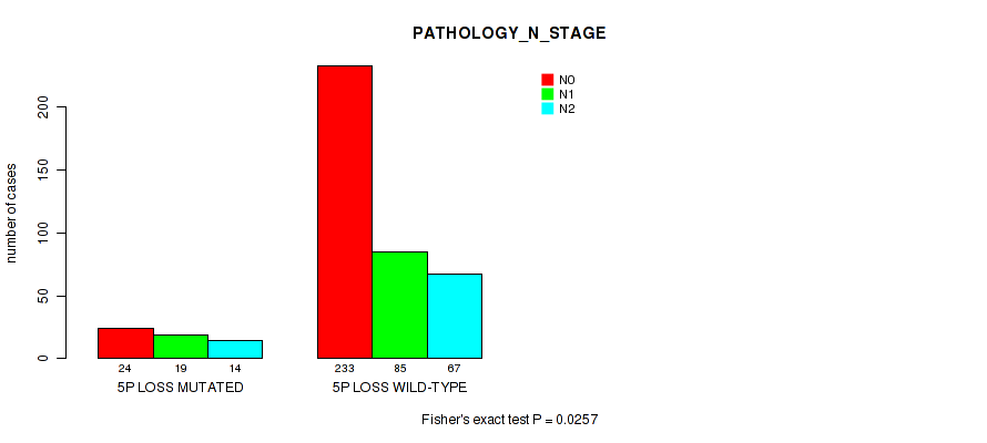 5p loss cnv correlated to 'NEOPLASM_DISEASESTAGE', 'PATHOLOGY_N_STAGE', 'RADIATIONS_RADIATION_REGIMENINDICATION', and 'NUMBER_OF_LYMPH_NODES'.