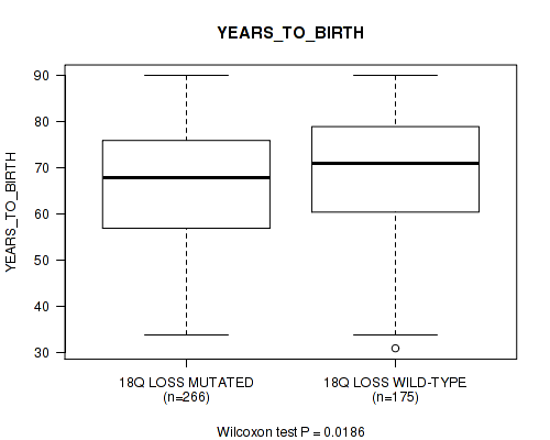 18q loss cnv correlated to 'YEARS_TO_BIRTH', 'NEOPLASM_DISEASESTAGE', 'PATHOLOGY_N_STAGE', 'PATHOLOGY_M_STAGE', 'HISTOLOGICAL_TYPE', and 'NUMBER_OF_LYMPH_NODES'.
