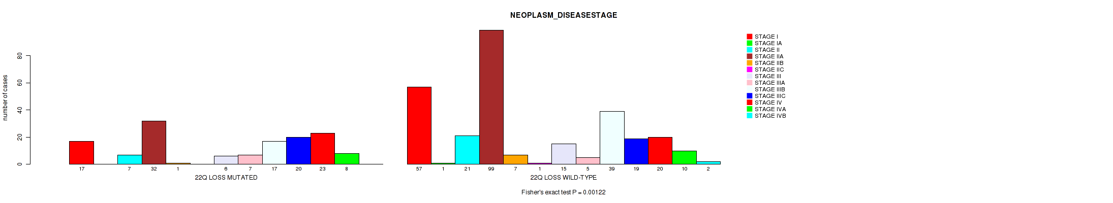 Figure S196. Get High-res Image Gene #79: '22q loss' versus Clinical Feature #3: 'NEOPLASM_DISEASESTAGE'