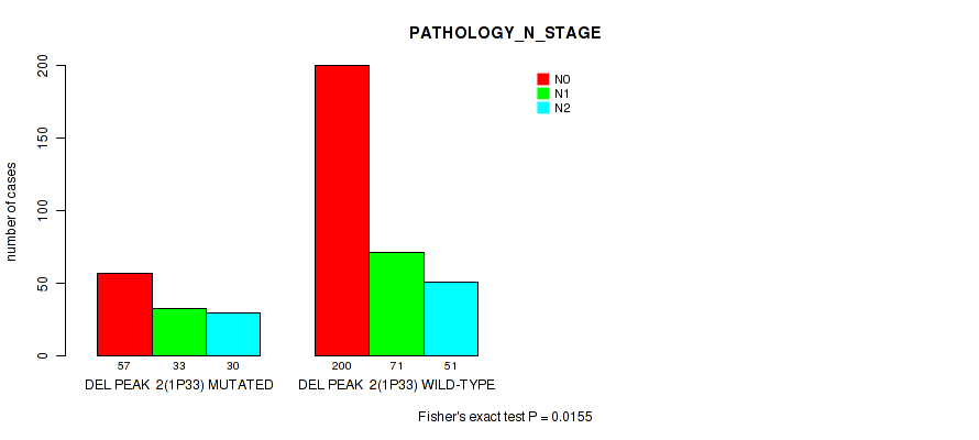 del_1p33 cnv correlated to 'Time to Death', 'NEOPLASM_DISEASESTAGE', 'PATHOLOGY_N_STAGE', 'PATHOLOGY_M_STAGE', 'HISTOLOGICAL_TYPE', and 'NUMBER_OF_LYMPH_NODES'.