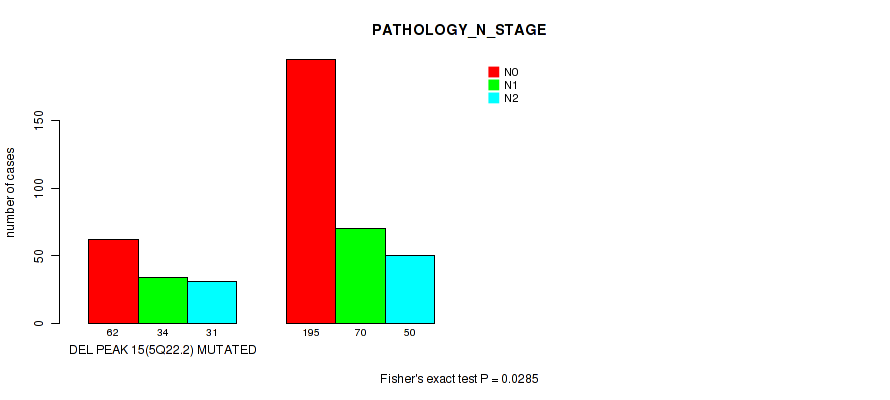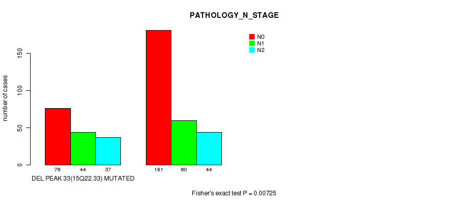 del_15q22.33 cnv correlated to 'NEOPLASM_DISEASESTAGE', 'PATHOLOGY_N_STAGE', 'PATHOLOGY_M_STAGE', 'HISTOLOGICAL_TYPE', 'RADIATIONS_RADIATION_REGIMENINDICATION', and 'NUMBER_OF_LYMPH_NODES'.