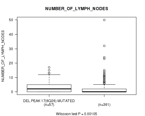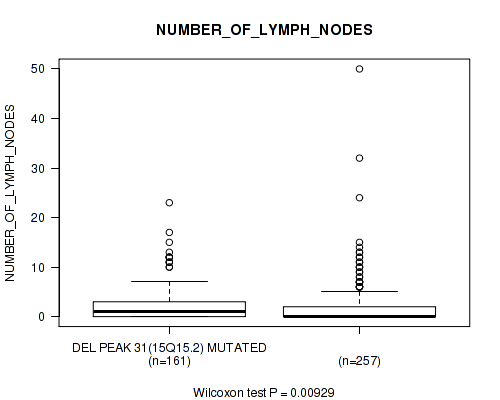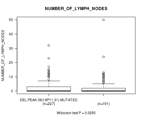Figure S256. Get High-res Image Gene #65: 'del_18q21.2' versus Clinical Feature #11: 'NUMBER_OF_LYMPH_NODES'